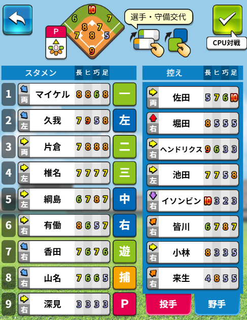 守備型の選手である綱島や香田、山名も上記選手と比べると見劣りするだけで全く何もできない訳ではなく(HRを狙える長打7があるのがありがたい。綱島も絶好調なら7を超える他、粘り強い持ちなのでバントヒットも狙える)、控えのヘンドリクスやイソンビンはパワーが魅力で代打要員も揃っている。チームとしての走力は佐田の走力10の他、片倉、久我、マイケル、池田が8とそれなりに速い。